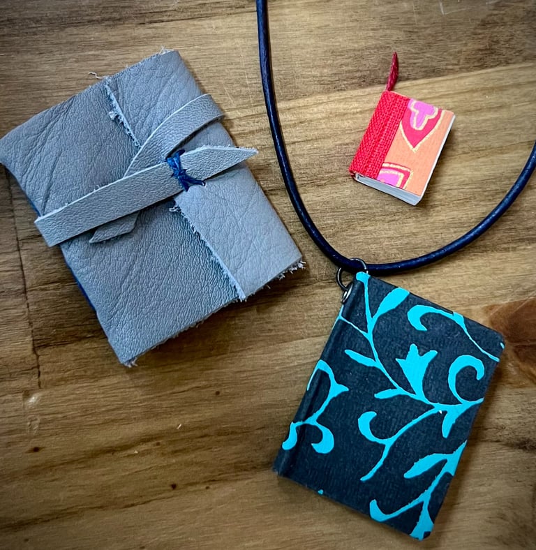 Learn three ways to tiny books for use as ornaments, jewelry, trinkets, and more! Students will learn simple binding techniques and make one leather bound ornament, a hardcover book necklace - complete with jewelry findings, and several tiny book charms. All supplies included.