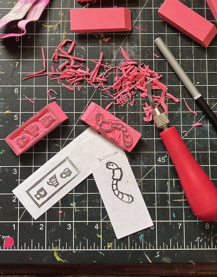 Learn how to use the humble pink eraser as a wonderful tool for creative expression! Relief printmaking is never easier than when using erasers as your carving material. In this class students will learn important relief printmaking techniques including sketching simple designs (no drawing experience required!), transferring your designs to the eraser, safe and easy use of the carving tools, and making creative prints with the finished stamps. Eraser stamps use readily accessible materials to make a great artistic impact. Join us for a fun afternoon in the studio! All materials included.